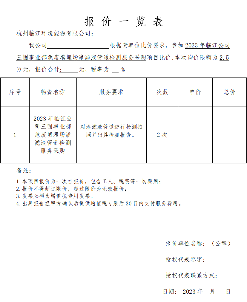根據(jù)《危險(xiǎn)廢物填埋污染控制標(biāo)準(zhǔn)2019》第10.5條企業(yè)應(yīng)對(duì)滲濾滴導(dǎo)排管道要進(jìn)行定期檢測和清淤,三固事業(yè)部需要委托第三方服務(wù)機(jī)構(gòu)對(duì)滲濾液管道進(jìn)行檢測,并出具檢測報(bào)告,歡迎符合要求的供應(yīng)商積極參與。